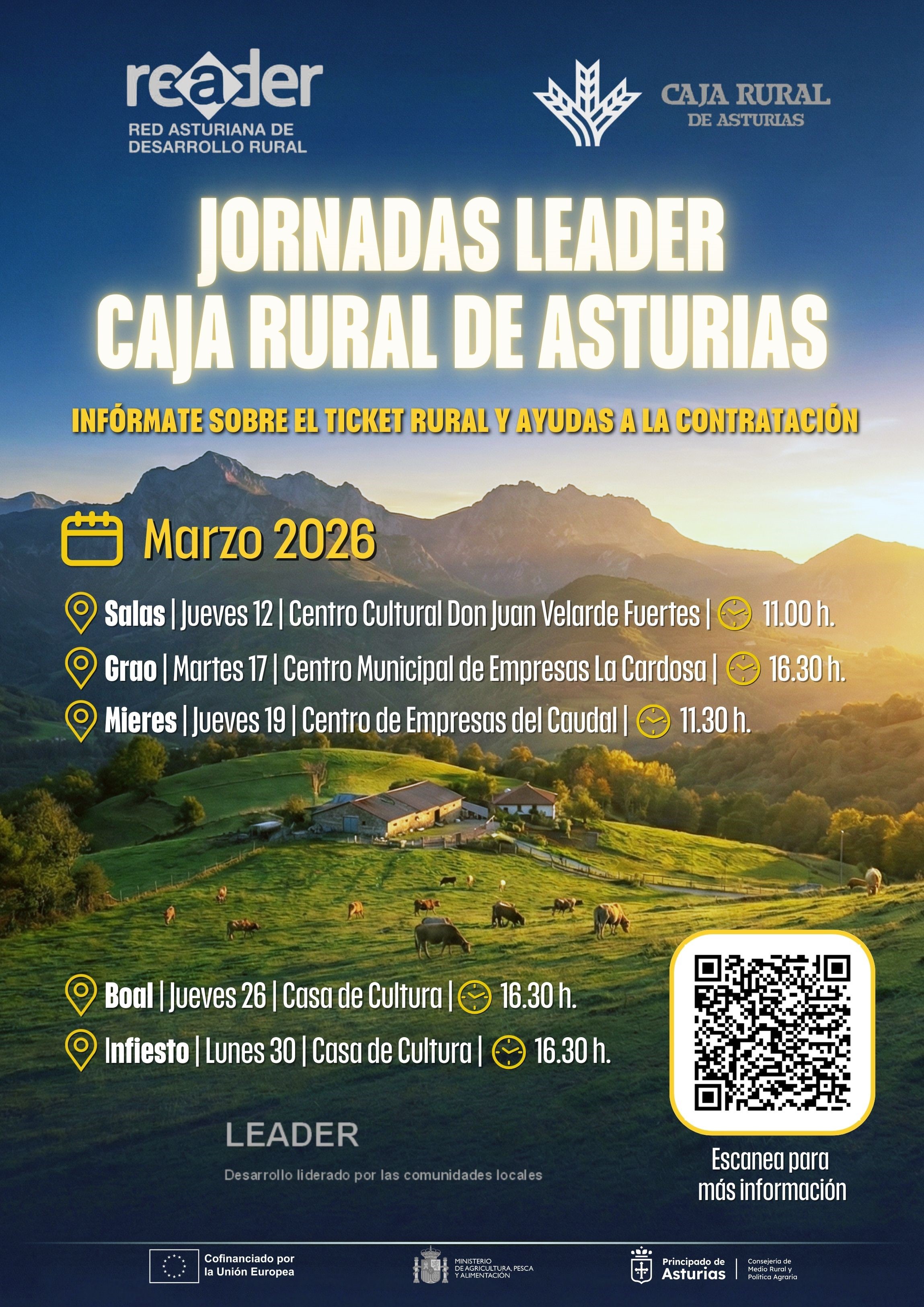 Con motivo del lanzamiento de las nuevas convocatorias de ayudas Leader 2026, la Red Asturiana de Desarrollo Rural y Caja Rural de Asturias han organizado una serie de jornadas de difusión durante el mes de marzo de 2026, fundamentalmente enfocadas al Tique Rural y a las ayudas a la contratación, conocidas como Tique Asalariado.