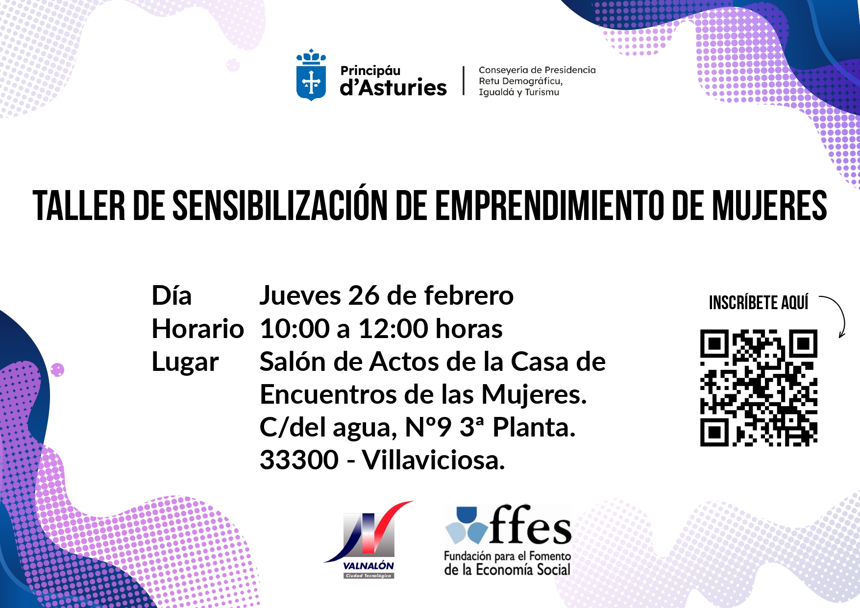 Valnalón y la Fundación para el Fomento de la Economía Social organizan dos Talleres de Sensibilización en Emprendimiento de Mujeres que se impartirán en Nava y Villaviciosa los días 24 y 26 de febrero respectivamente.