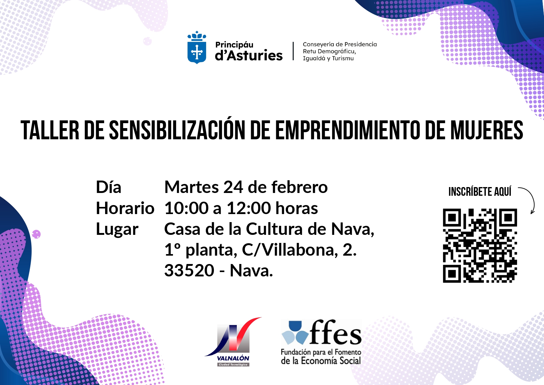 Valnalón y la Fundación para el Fomento de la Economía Social organizan dos Talleres de Sensibilización en Emprendimiento de Mujeres que se impartirán en Nava y Villaviciosa los días 24 y 26 de febrero respectivamente.